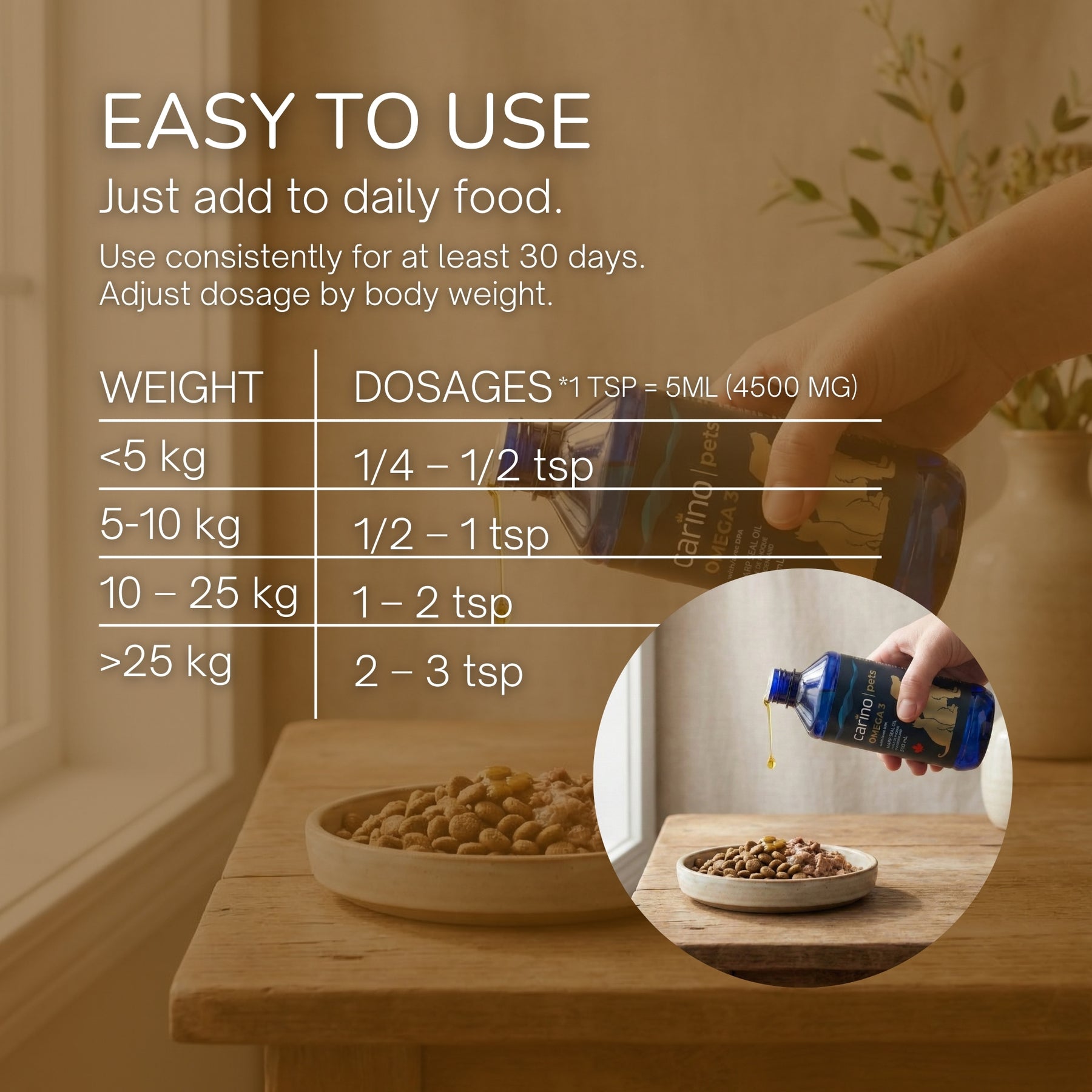 - 每日使用,有助於維護關節、皮膚、毛髮和整體活力。